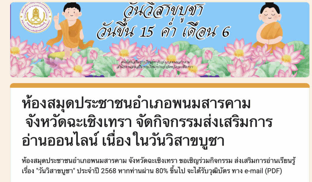 เกียรติบัตรออนไลน์ฟรี อบรมออนไลน์ ทำแบบทดสอบออนไลน์รับเกียรติบัตร ห้องสมุดประชาชนอำเภอพนมสารคาม เนื่องในวันวิสาขบูชา 2568