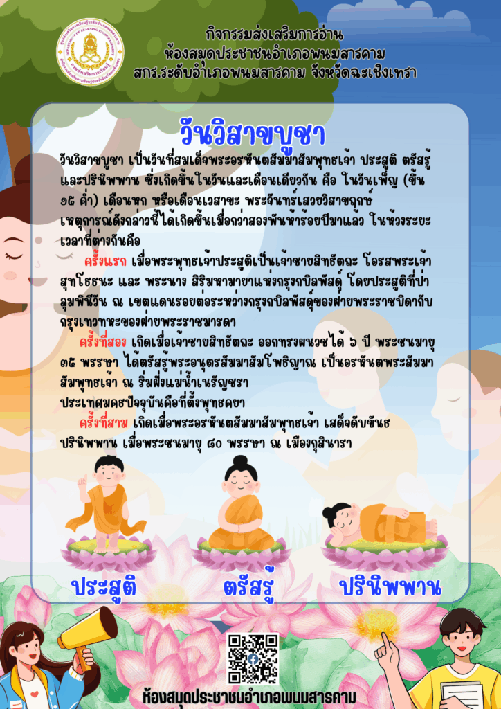 เนื่องในวันวิสาขบูชา ห้องสมุดประชาชนอำเภอพนมสารคาม จังหวัดฉะเชิงเทรา ขอเชิญร่วมกิจกรรม ส่งเสริมการอ่านออนไลน์ พร้อมทำ แบบทดสอบออนไลน์วันวิสาขบูชา เพื่อเรียนรู้หลักธรรมทางพระพุทธศาสนา
