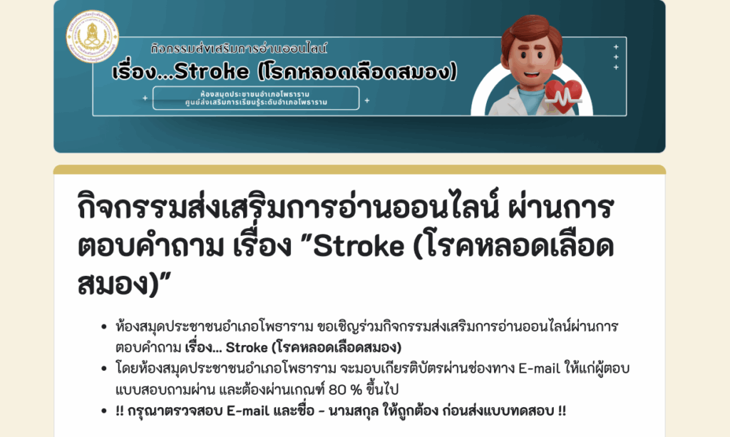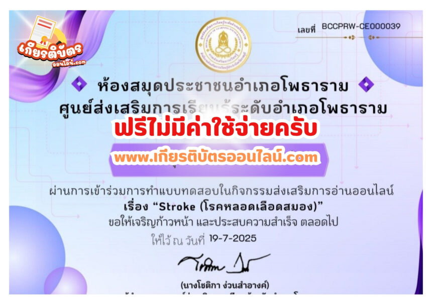 เกียรติบัตรฟรี แบบทดสอบออนไลน์ กิจกรรมส่งเสริมการอ่านออนไลน์ ผ่านการตอบคำถาม เรื่อง Stroke โรคหลอดเลือดสมอง สกร.โพธาราม 2568