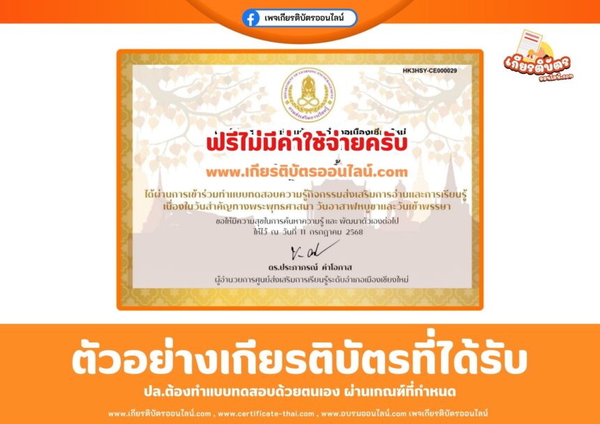 เกียรติบัตรออนไลน์ฟรี แบบทดสอบออนไลน์ กิจกรรมส่งเสริมการอ่าน วันอาสาฬหบูชา วันเข้าพรรษา ห้องสมุดเชียงใหม่ 2568