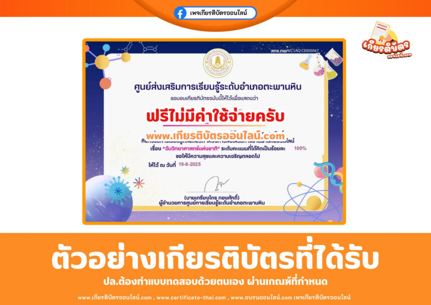 เกียรติบัตรออนไลน์ฟรี เพียงทำแบบทดสอบ วันวิทยาศาสตร์แห่งชาติ ตะพานหิน 2568