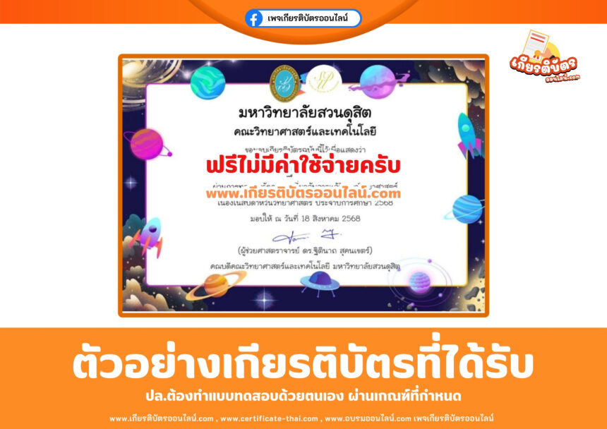 เกียรติบัตรออนไลน์ฟรี เพียงทำแบบทดสอบ สัปดาห์วิทยาศาสตร์ มหาวิทยาลัยสวนดุสิต 2568