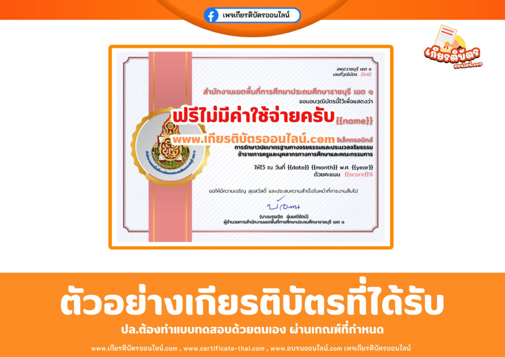 เกียรติบัตรออนไลน์ฟรี วุฒิบัตรการวัดผลประเมินผลประมวลจริยธรรมข้าราชการครูและบุคลากรทางการศึกษา และคณะกรรมการ ราชบุรีเขต 1