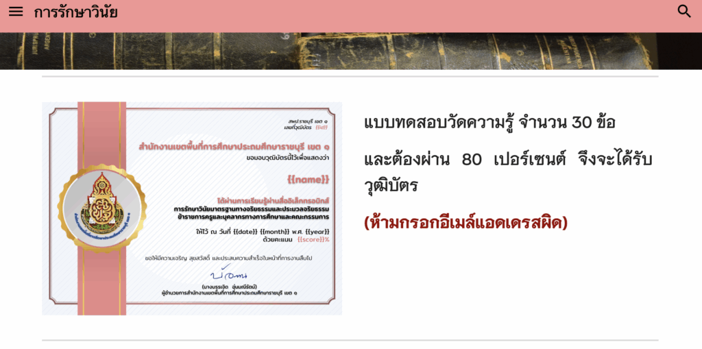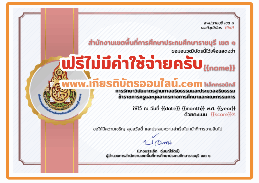 เกียรติบัตรออนไลน์ฟรี วุฒิบัตรการวัดผลประเมินผลประมวลจริยธรรมข้าราชการครูและบุคลากรทางการศึกษา และคณะกรรมการ ราชบุรีเขต 1