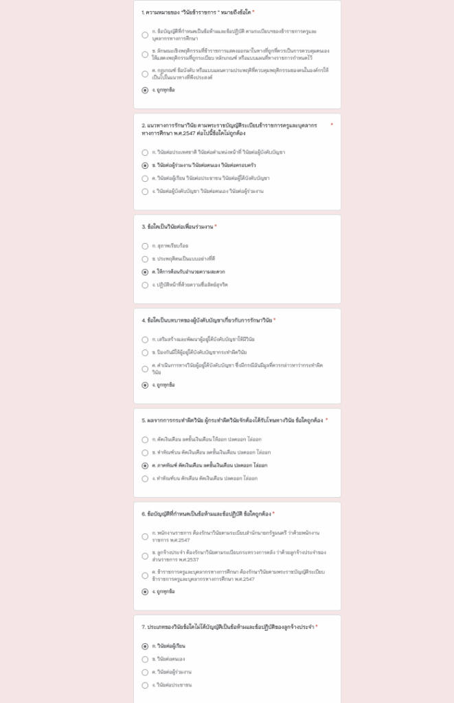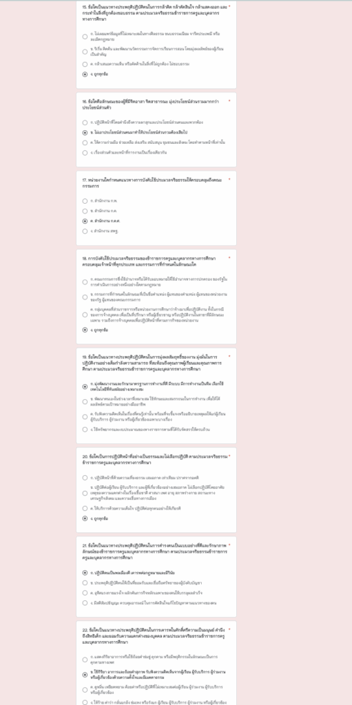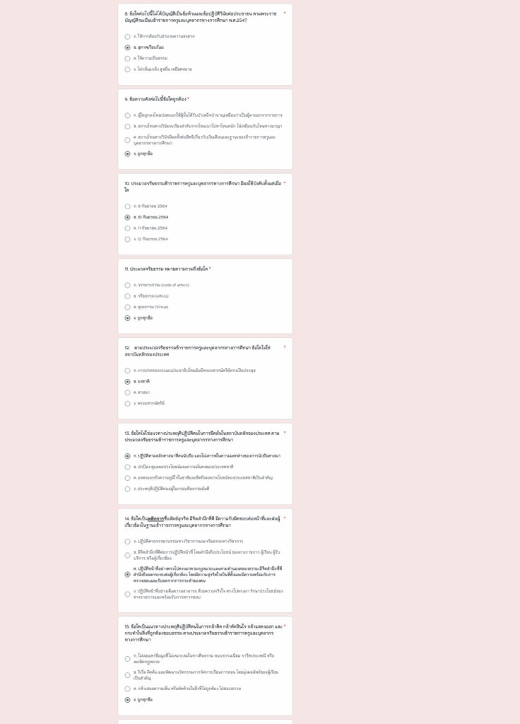 แบบทดสอบนี้จัดทำขึ้นเพื่อ ประเมินความรู้ ความเข้าใจ ของข้าราชการครู บุคลากรทางการศึกษา และคณะกรรมการ เกี่ยวกับการรักษาวินัย มาตรฐานทางจริยธรรม และประมวลจริยธรรม เพื่อให้ผู้เข้าร่วมตระหนักถึงหลักคุณธรรมและจรรยาบรรณวิชาชีพ