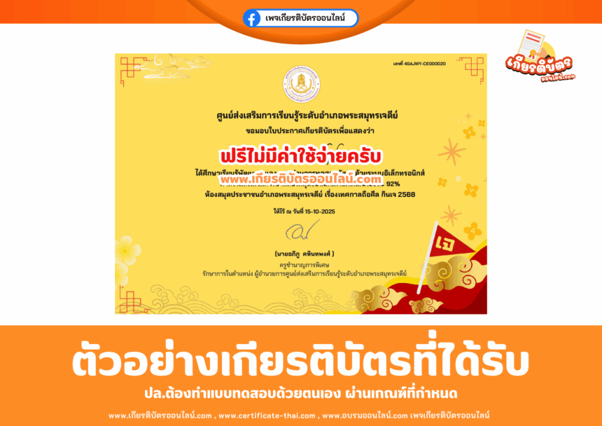เกียรติบัตรออนไลน์ฟรี ทำแบบทดสอบออนไลน์ วันถือศีลกินเจ ห้องสมุดพระสมุทรเจดีย์ 2568