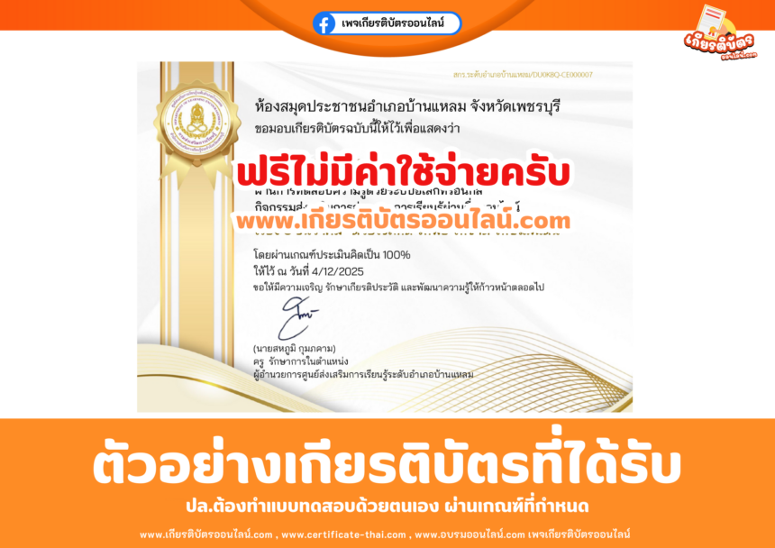 เกียรติบัตรออนไลน์ฟรี ทำแบบทดสอบห้องสมุดประชาชนอำเภอบ้านแหลมจังหวัดเพชรบุรี เรื่อง 5 ธันวาคม ด้วยใจภักดี รักพ่อ รักชาติ รักษ์แผ่นดิน 2568
