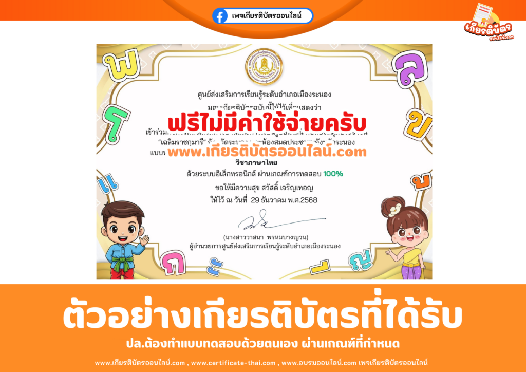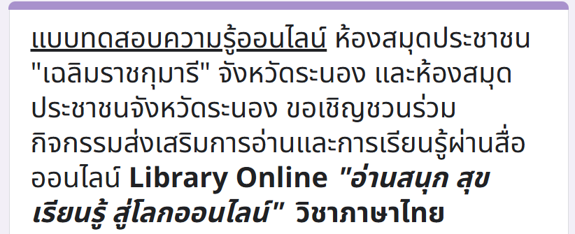 เกียรติบัตรออนไลน์ฟรี ทำแบบทดสอบศูนย์ส่งเสริมการเรียนรู้ระดับอำเภอเมืองระนอง Library Online อ่านสนุก สุขเรียนรู้ สู่โลกออนไลน์ วิชาภาษาไทย 2569