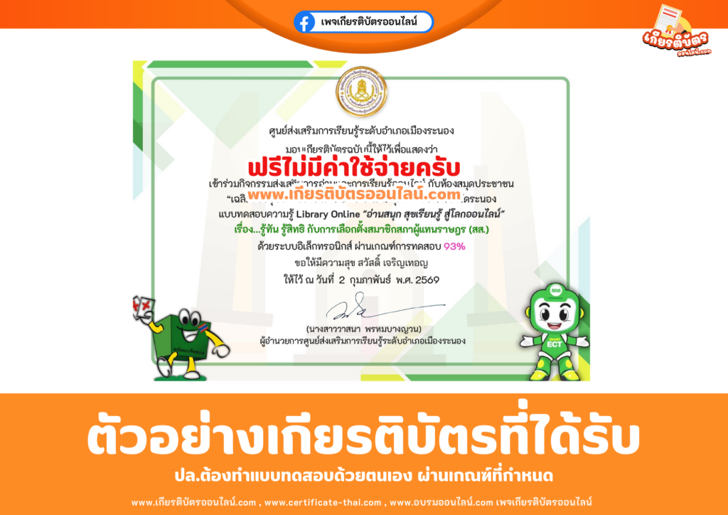 เกียรติบัตรออนไลน์ฟรี ทำแบบทดสอบศูนย์ส่งเสริมการเรียนรู้ระดับอำเภอเมืองระนอง เรื่อง รู้ทัน รู้สิทธิ กับการเลือกตั้งสมาชิกสภาผู้แทนราษฎร (สส.) 2569