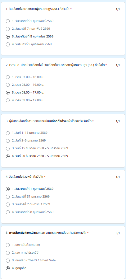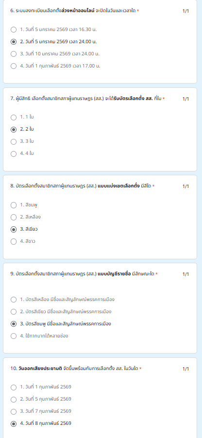 1. ผู้ร่วมกิจกรรมส่งเสริมการอ่านและการเรียนรู้ผ่านระบบ Google forms ทำแบบทดสอบความรู้ เรื่อง.. รู้ทัน รู้สิทธิ กับการเลือกตั้งสมาชิกสภาผู้แทนราษฎร (สส.)