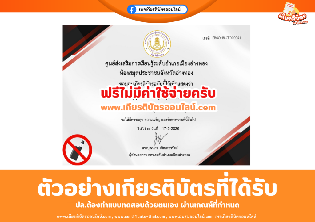 เกียรติบัตรออนไลน์ฟรี ทำแบบทดสอบศูนย์ส่งเสริมการเรียนรู้ระดับอำเภอเมื่ออ่างทอง ห้องสมุดประชาชนจังหวัดอ่างทอง เรื่อง รู้ทันบุหรี่ไฟฟ้า 2569