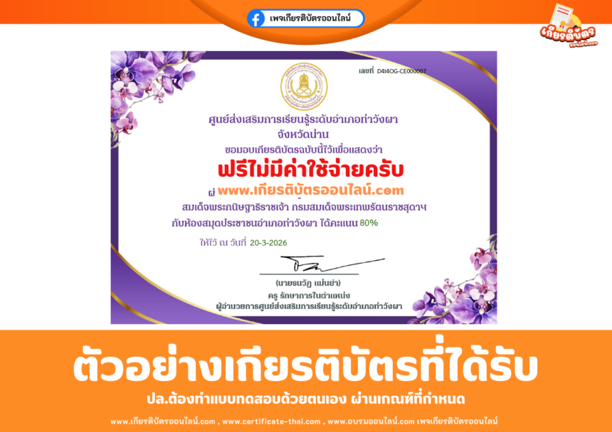 เกียรติบัตรออนไลน์ฟรี ทำแบบทดสอบออนไลน์ศูนย์ส่งเสริมการเรียนรู้ระดับอำเภอท่าวังผา จังหวัดน่าน เรื่อง 71 พรรษา สมเด็จพระกนิษฐาธิราชเจ้า กรมสมเด็จพระเทพรัตนราชสุดาฯ 2569